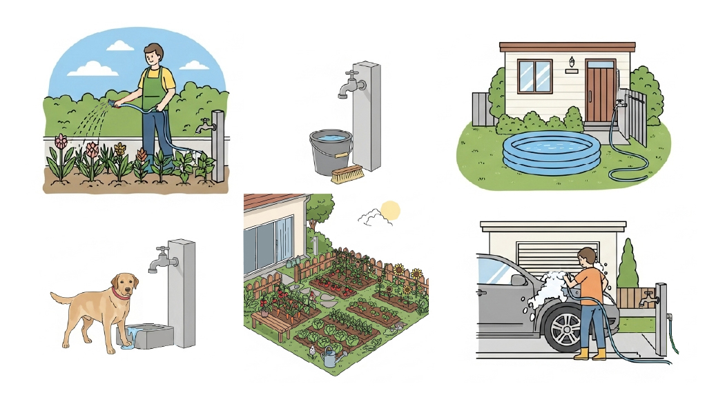 ガーデニングの水やりはもちろん、洗車や玄関まわりの掃除、散歩帰りのワンちゃんの足を洗ったりなどなど、暮らしの中での“外でちょっと水を使いたい”という場面に大変役立ちます。