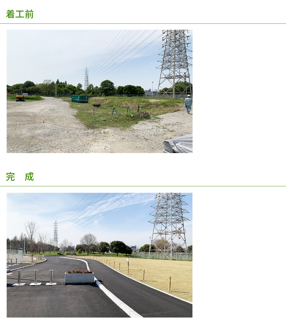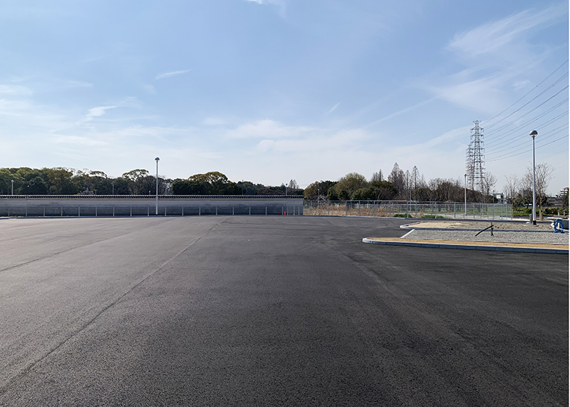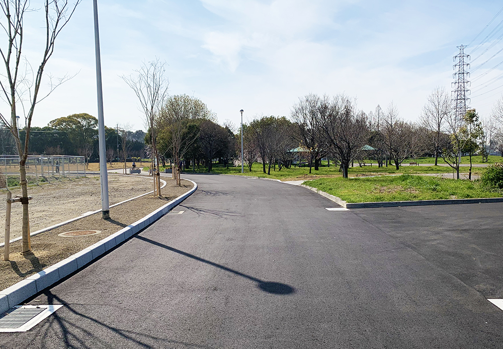 美しく仕上がった黒のアスファルト舗装と、これから緑になっていく芝生のコントラストが美しい景観になりそうです。