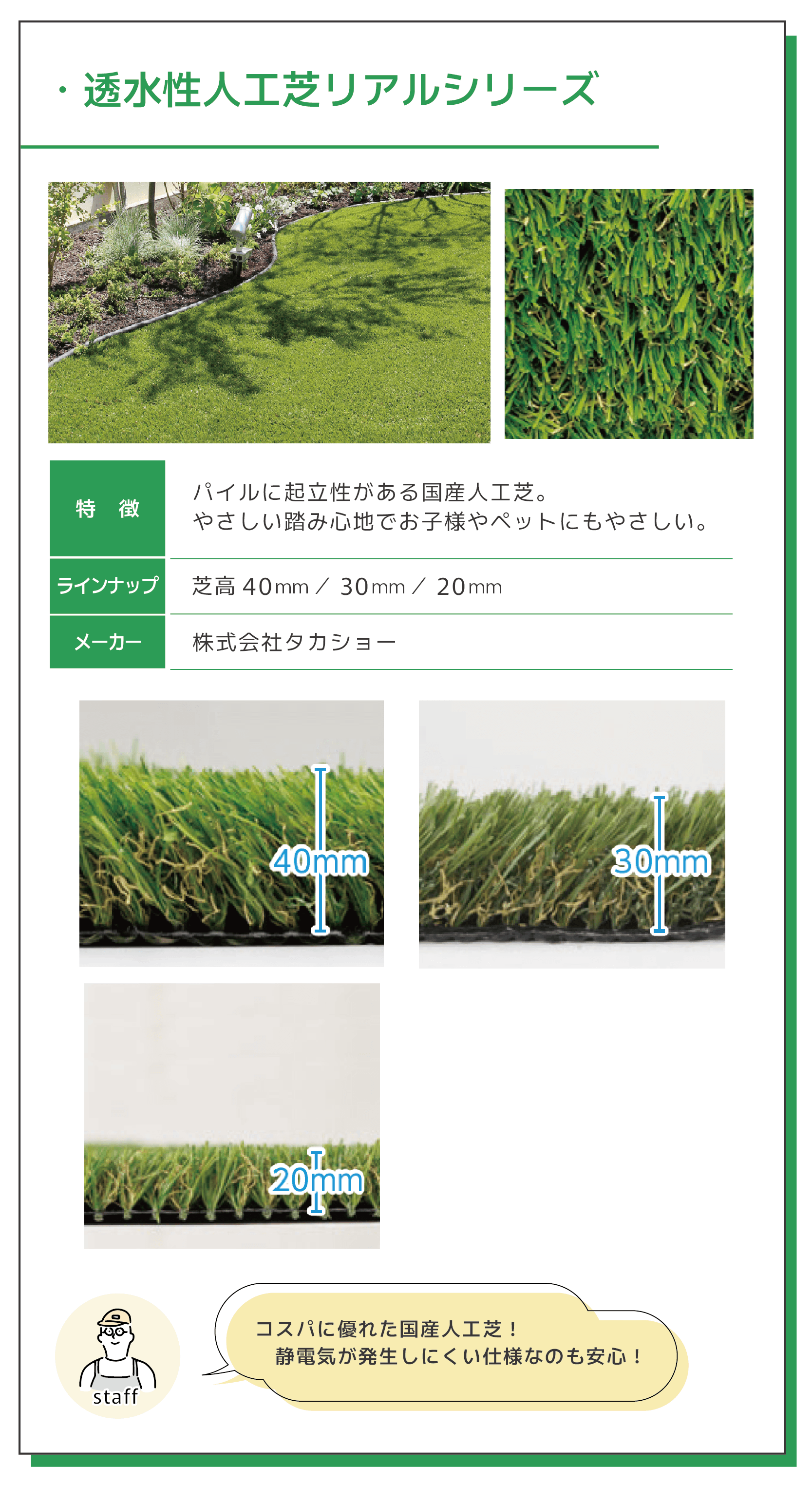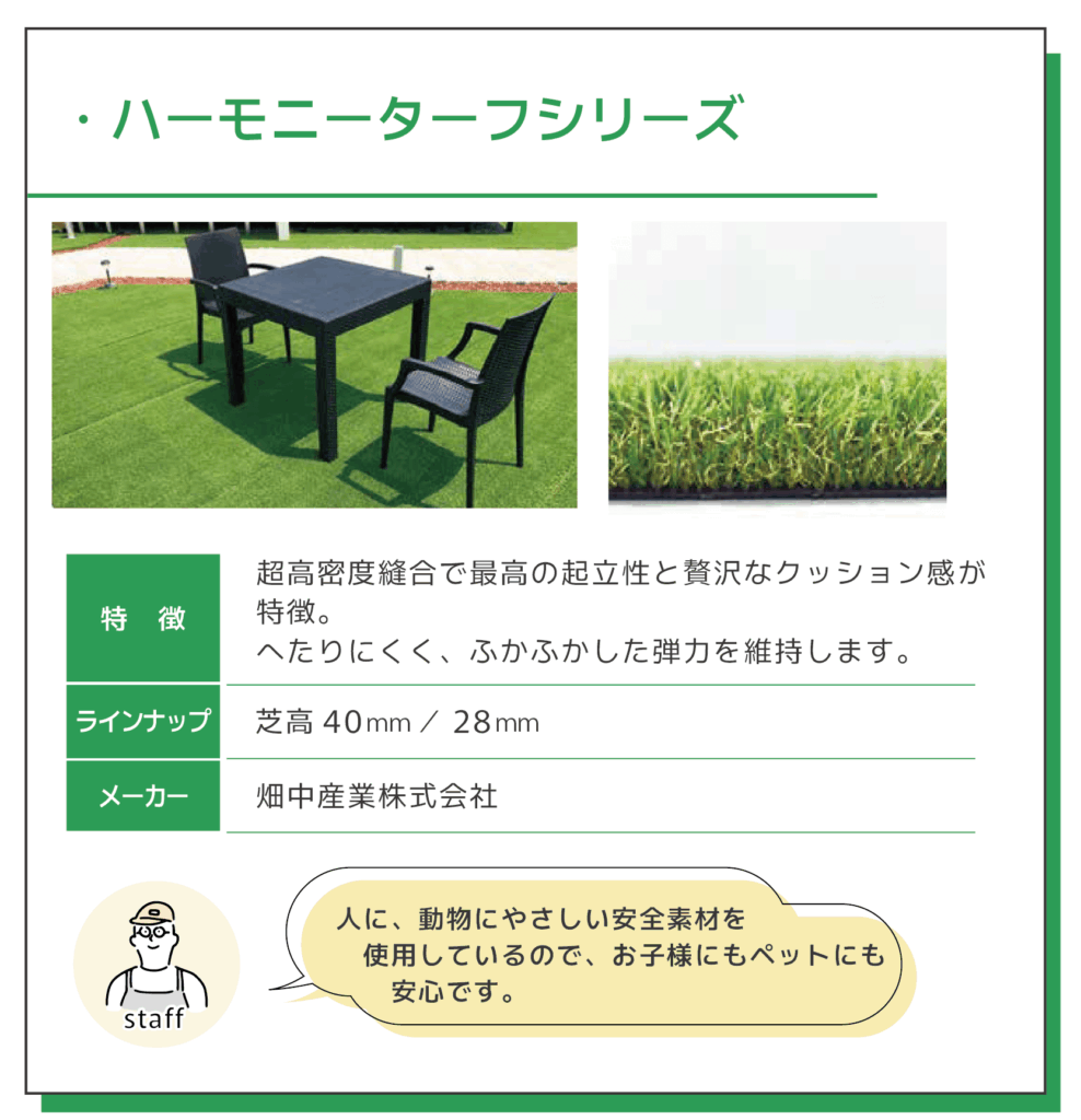 展示販売するものは、リアルな人工芝を開発・販売しているトップメーカーのもののみをご用意!