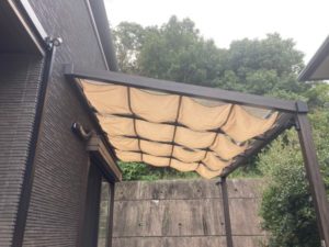 お庭でBBQや、お子様のプールで楽しむためにガーデンリフォームをご計画。室内とお庭をつなぐ空間として、広い木樹脂デッキを設置。少々の雨でもお庭に出れる様に、木目調のオシャレなテラス屋根も設置しました。屋根には日よけカーテンが付いてるので、日差しのきつい日でも安心。